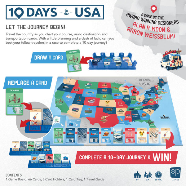 A Road trip for All Ages - In 10 Days in the USA, you will travel the country by jet, car, and on foot. Plan your trip from start to finish using destination and transportation tiles. With a little luck and clever planning, you just might outwit your fellow travelers.