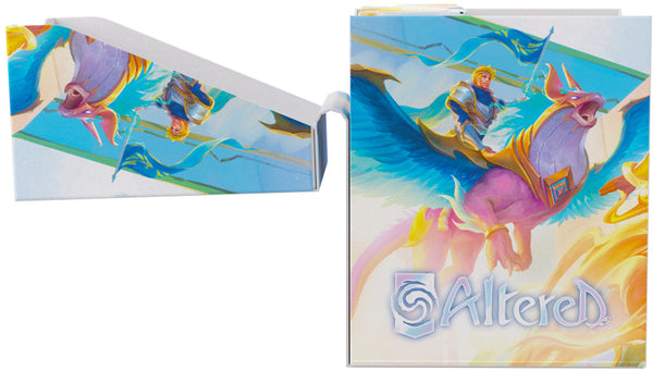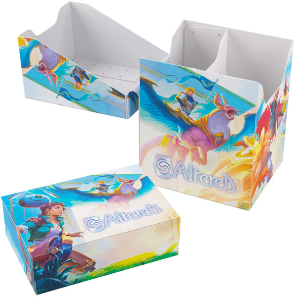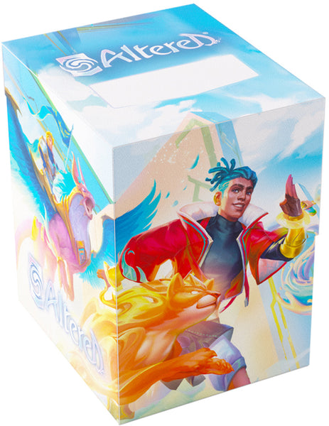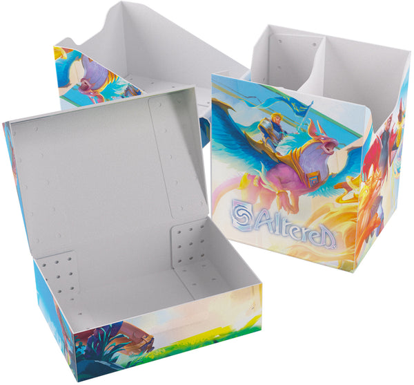 The Altered® Expedition Soft Box is the all-in-one casual solution for players of the highly awaited TCG. This full color printed and officially licensed deck box is packed with ingenious features. It protects a full double-sleeved deck of cards and includes an innovative token box! This token box has a smart click-lock mechanism to keep all tokens safely stored – even while pulling it out. Once opened, the lid of the box stays upright for convenient access during gameplay. The Expedition Soft Box is equipped with Gamegenic’s very own Cobra Neck-Technology: the lid can be opened more than 180° for easy access. Additionally, it comes with a self-locking lid and write-on-strip. The separator inside ensures that the deck stays in place, even when the token box is taken out. The Altered® Expedition Soft Box comes in two amazing designs from the game and is a must-have for all Altered®, TCG, and LCG players.