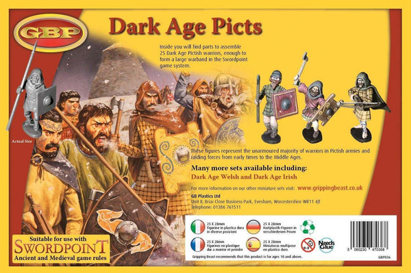 Inside you will find parts to assemble 25 Dark Age Pictish warriors, enough to form a large warband in the Swordpoint game system. These figures represent the unarmoured majority of warriors in Pictish armies and raiding forces from early times to the Middle Ages.