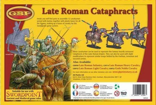 This product contains twelve multi-part plastic Late Roman heavily armoured Cavalrymen mounted on fully cataphract armoured horses. Inside you will find parts to assemble 12 finely-detailed armoured cavalry with kontos, suitable for use in Swordpoint. Parts from this box are compatible with most parts from other GBP box sets so you can do many, many conversions.