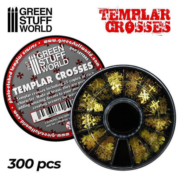 Collection of 300 Templar Cross symbols and signs made of brass. There are 12 different types to choose from, separated in different compartments. They are perfect for adding details to armour, weapons and banners of your models and miniatures or for decorating dioramas. We recommend using cyanocrylate glue in small quantities.
