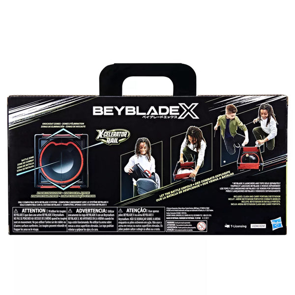Rail Rush Beystadium features a dual rail system that propels tops through the rails and into the Battle Ring for intense head-to-head clashes. Slingshock rail system hurtles tops around curves and redirects them towards epic burst moments. Bladers can keep the Performance Tips in Battle Ring Mode to defend their position in the Beystadium, or convert them to Slingshock Mode to ride the rails and charge into battle.
