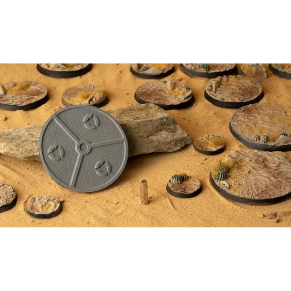 • This blister contains 2 thermoplastic 60mm wide round Battle Ready Bases, in a Deserts of Maahl theme.