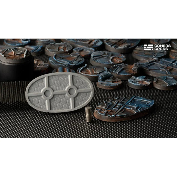 • This blister contains 4 thermoplastic 60mm wide oval Battle Ready Base, in a Spaceship Corridor theme.