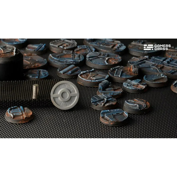 • This blister contains 10 thermoplastic 25mm wide round Battle Ready Bases, in a Spaceship Corridor theme.