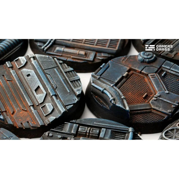 • This blister contains 5 thermoplastic 40mm wide round Battle Ready Bases, in a Spaceship Corridor theme.