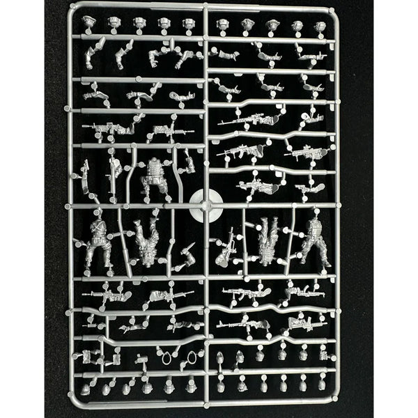 Freeze, flee, or fight? This hard plastic box set lets you build them all! Two unique frames give you six unique bodies that you can customize to either hold weapons, open handed in flight, or you can even turn some into sign-holding protesters!