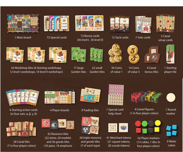 In the game, players represent merchants who travel on business trips and buy and sell goods in the various cities in the region. Resafa had no local sources of water, so it depended heavily on large cisterns to collect the spring and winter rainwater to make the area habitable. Players build water tanks and canals to distribute that water where it is needed. In the cities, they build workshops to help their businesses grow, which will allow them to collect resources and camels. They also construct gardens between the businesses, generating more resources and also victory points.