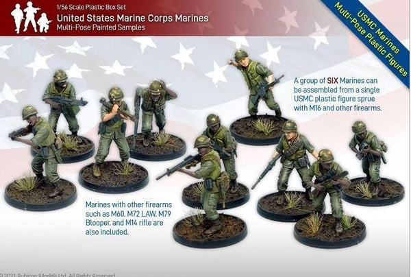 Product Highlights: - Includes 5 USMC sprues (6 figures each) - Includes 1 USMC Command sprue - A total of 30 figures with command squad option - Multi-pose plastic figures with different webbing and pouches - Multiple weapon choices, including M72 LAW