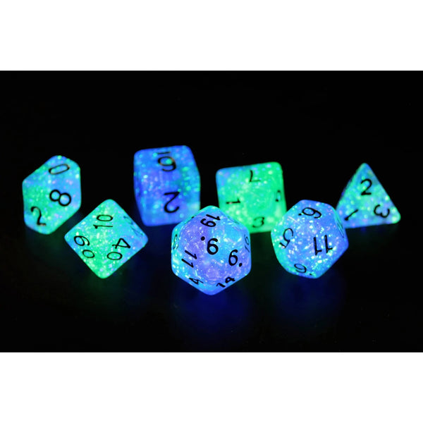 Purple and teal glow-in-the-dark dice set. Set of 7 polyhedral dice plus 1 extra D20. Packaged in a flat-bottom tube, so you can easily carry and store your dice. Style: Peacock Glowworm