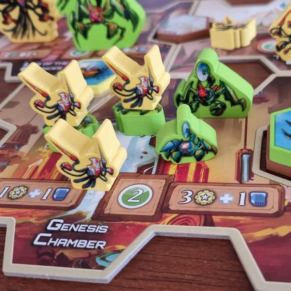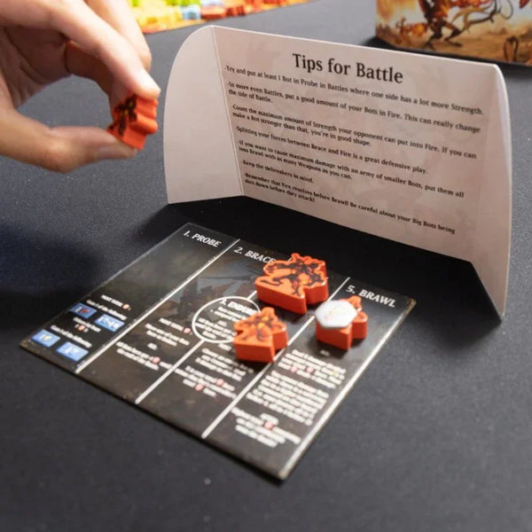 • Hidden Bidding Combat: Assign your Bots orders in a unique and thematic combat system with no dice or cards; YOU choose what your Bots will do. Probe your opponent to gain additional data or weapons for the future, snipe their Bots before they can strike, brace for impact, and then get ready to brawl! Plus, get data whenever you destroy something!