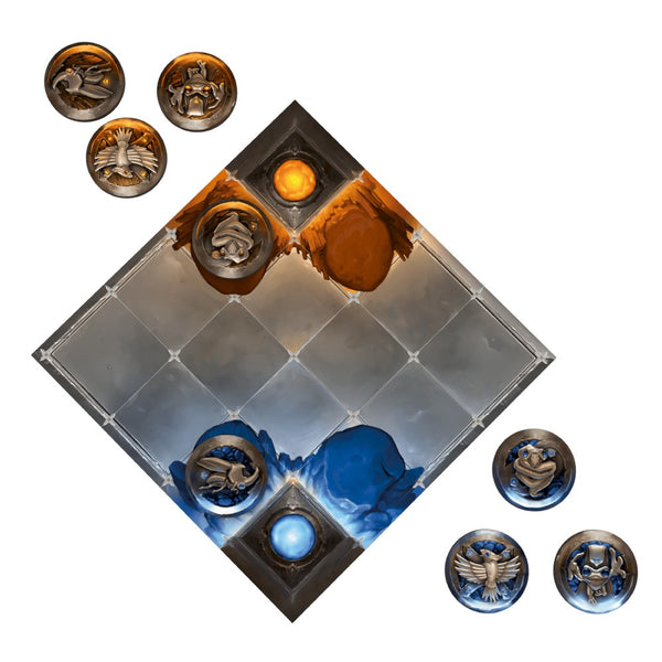 To set up, each player takes their six creature tokens, then they remove the same two types of tokens from play. Place the 4x4 game board with the corner of your color toward you. Choose a start player, who places one of their creatures with its active side up on one of the summoning spaces next to their corner; the other player then places one of their creatures on one of their summoning spaces.