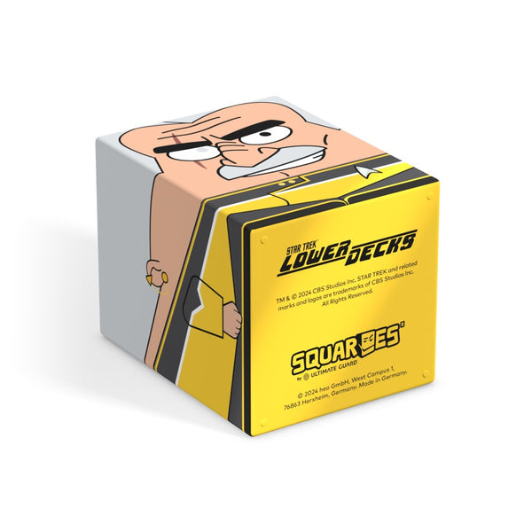 Collectible box for storing TCG decks, tabletop gaming accessories, and/or collectibles. The Shaxs Squaroe from the Star Trek: Lower Decks™ edition holds up to 100 cards in double protective sleeves if used as a deck box. Squaroes are made from 78% renewable resources and fit perfectly into the separately available Collectors Case.