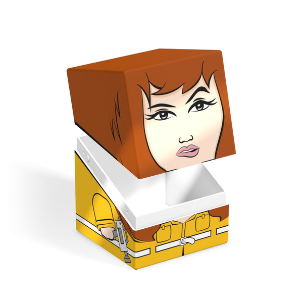 Collectible box for storing TCG decks, tabletop gaming accessories, and/or collectibles. The April Squaroe from the Teenage Mutant Ninja Turtles™ edition holds up to 100 cards in double protective sleeves if used as a deck box. Squaroes are made from 78% renewable resources and fit perfectly into the separately available Collectors Case.